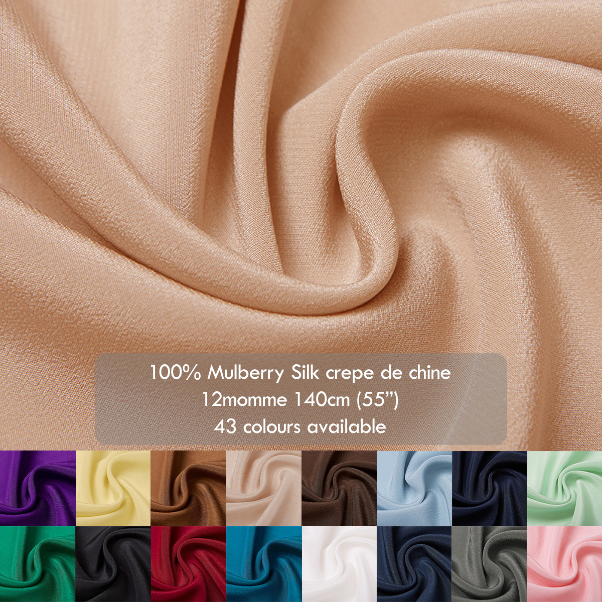 High-quality luxury 12 momme Silk crepe de chine fabric, 140cm(55inches) 100% mublerry silk CDC, it is made of natural mulberry silk, both sides are crepe type with a matte surface, for dress shirts casual dresses, and fashion dressmaking