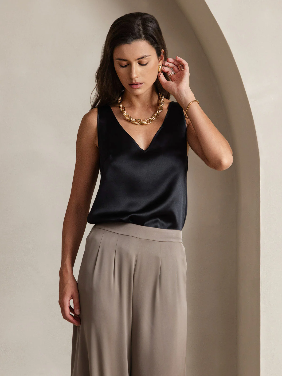 Made from a charmeuse mulberry silk blend with gentle stretch, this sleeveless V-neck top features a straight, fluid fit and a subtle sheen. Elegant and versatile, it’s designed for refined standalone wear or effortless layering.
