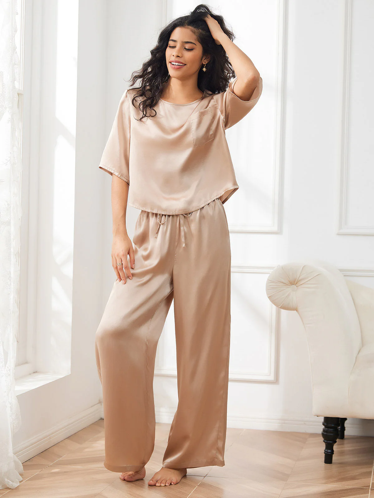 Made from 100% mulberry silk (19momme thickness) with no harmful substances, this pajama set features a relaxed top with a round neckline and chest pocket, paired with wide-leg pants with an elastic waist. Softly draping and naturally elegant, it offers effortless comfort for both lounging and sleep.